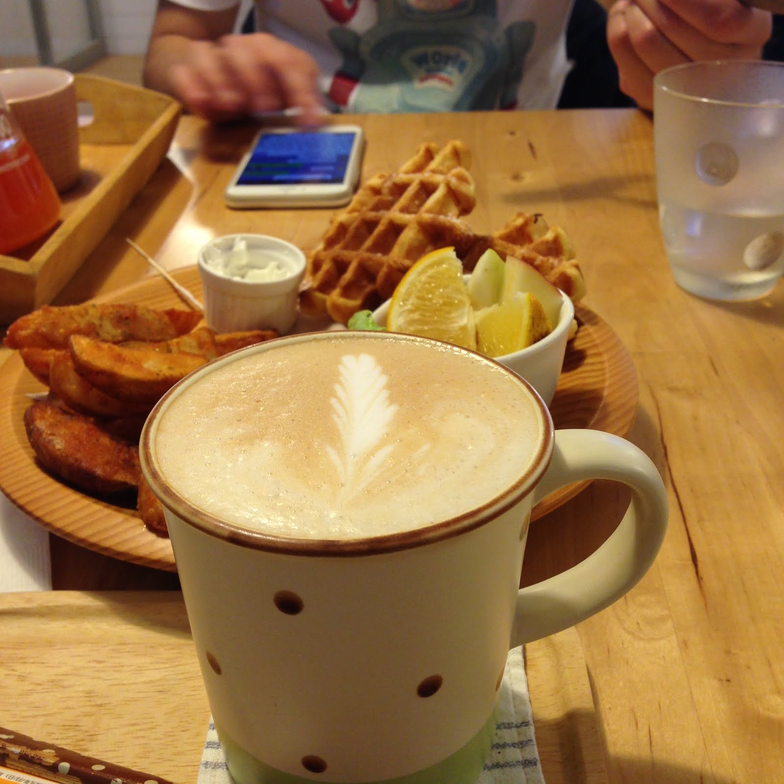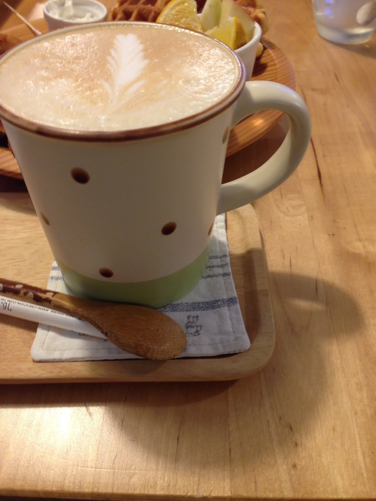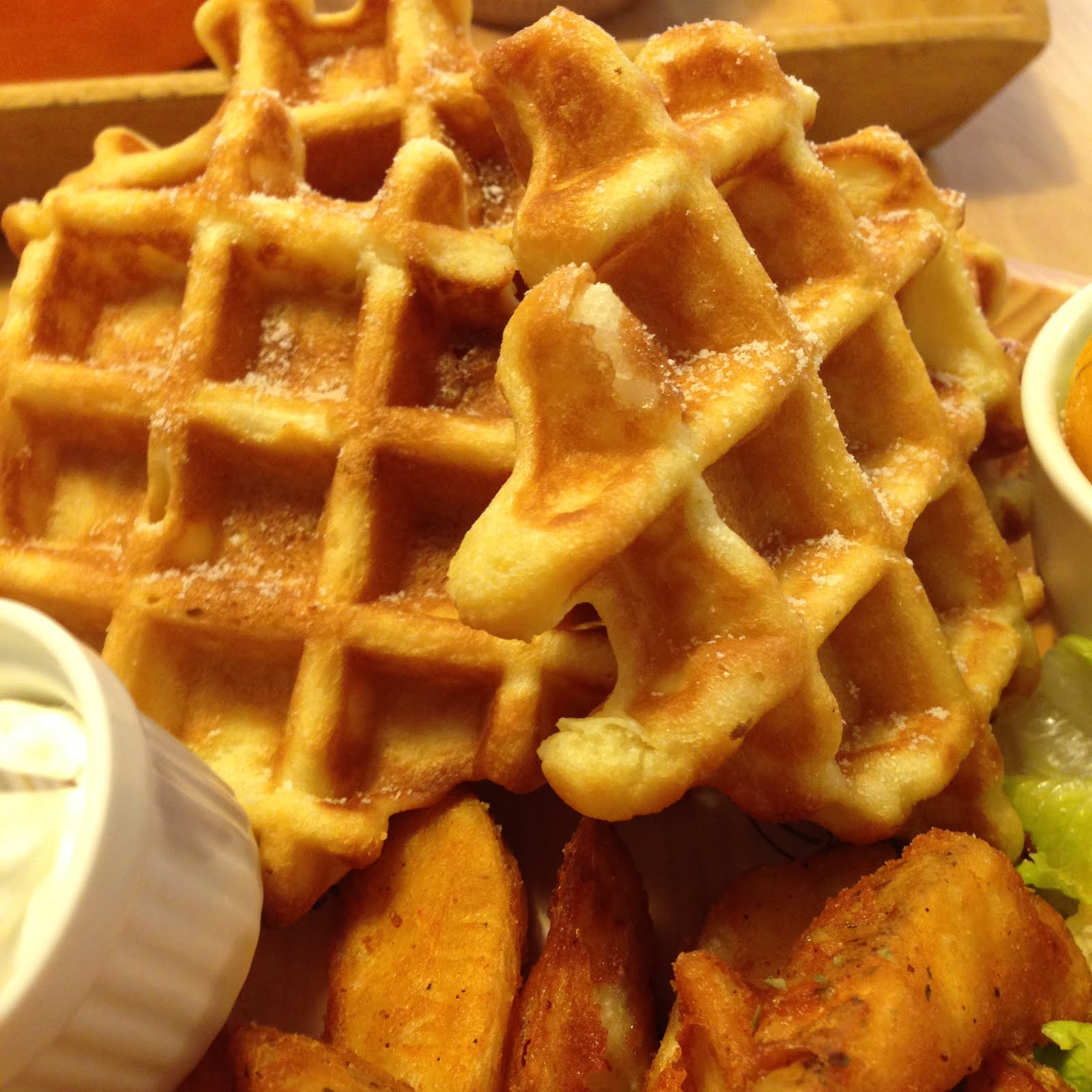 比利時鬆餅厚實,表面灑有些許糖霜,在沾附奶油食用,甜度適中,奶香四溢。
