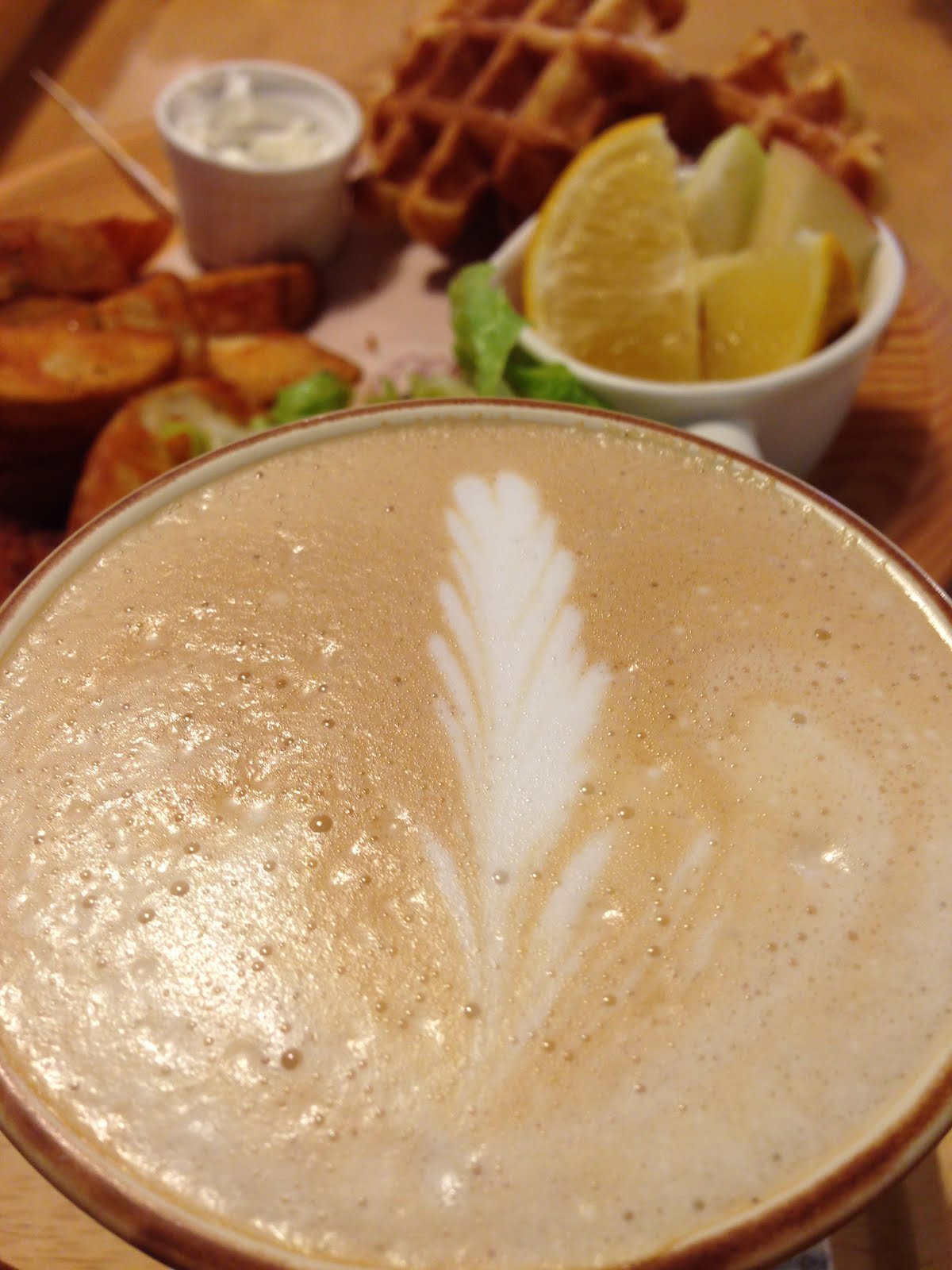 比利時鬆餅餐,還搭配帶皮馬鈴薯薯條、凱薩沙拉、水果。分量十足,可以兩人共食。