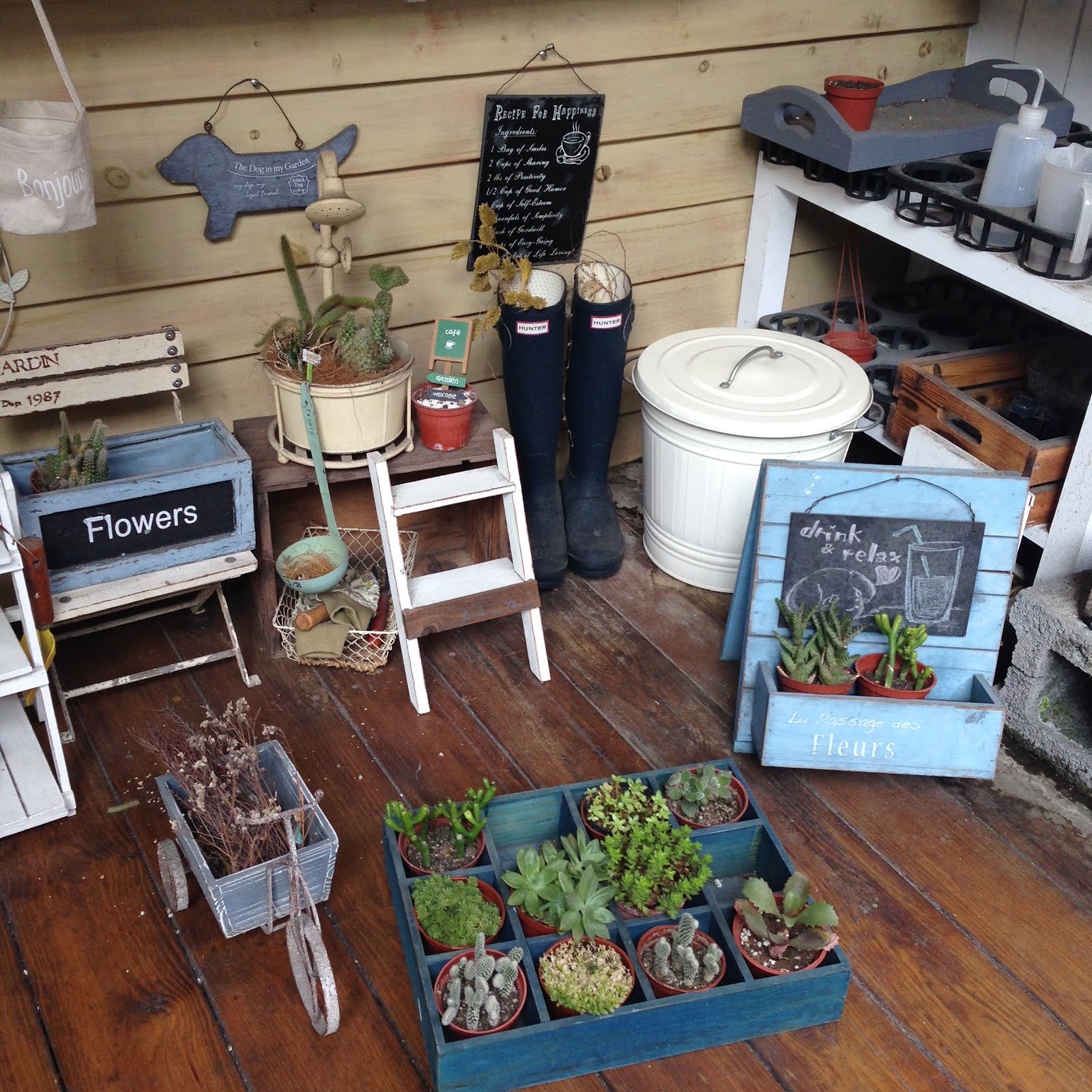 店門口特色以明亮的窗戶,還特別保留一小塊庭園區,搭配公園木椅凳,精心擺設小型盆栽與庭院工具等,營造溫馨可愛的的生活雜貨庭園風格,呈現好心情的愉悅。
